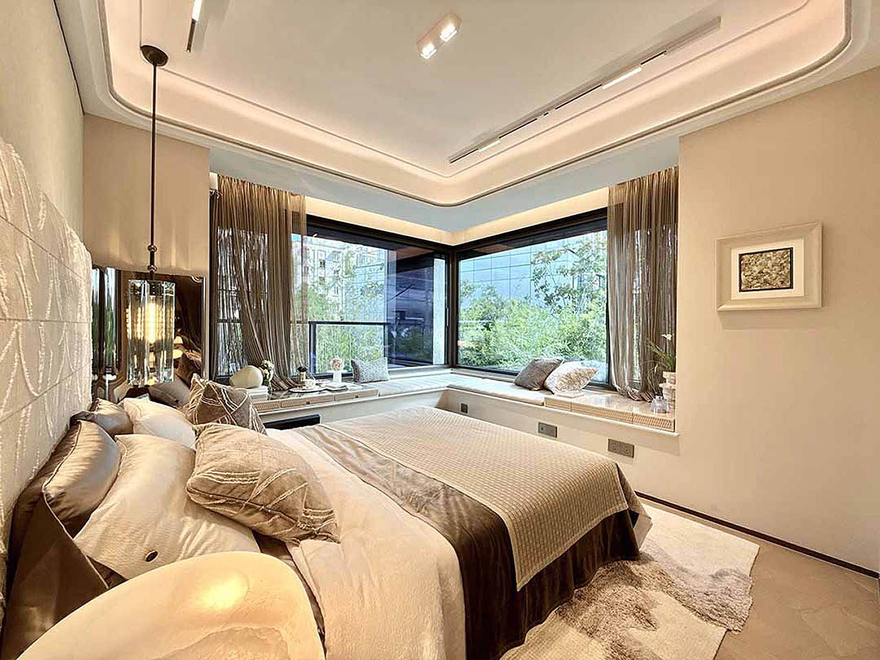光线与窗景,却各有侧重。全屋飘窗+南向半封阳台共同构成立体采光系统,全屋配置6-7处飘窗,采光面与观景面被双向放大。夜色亮起时,东边套揽江浦公园美景,西边套瞰杨浦内环城市新貌及三件套景。