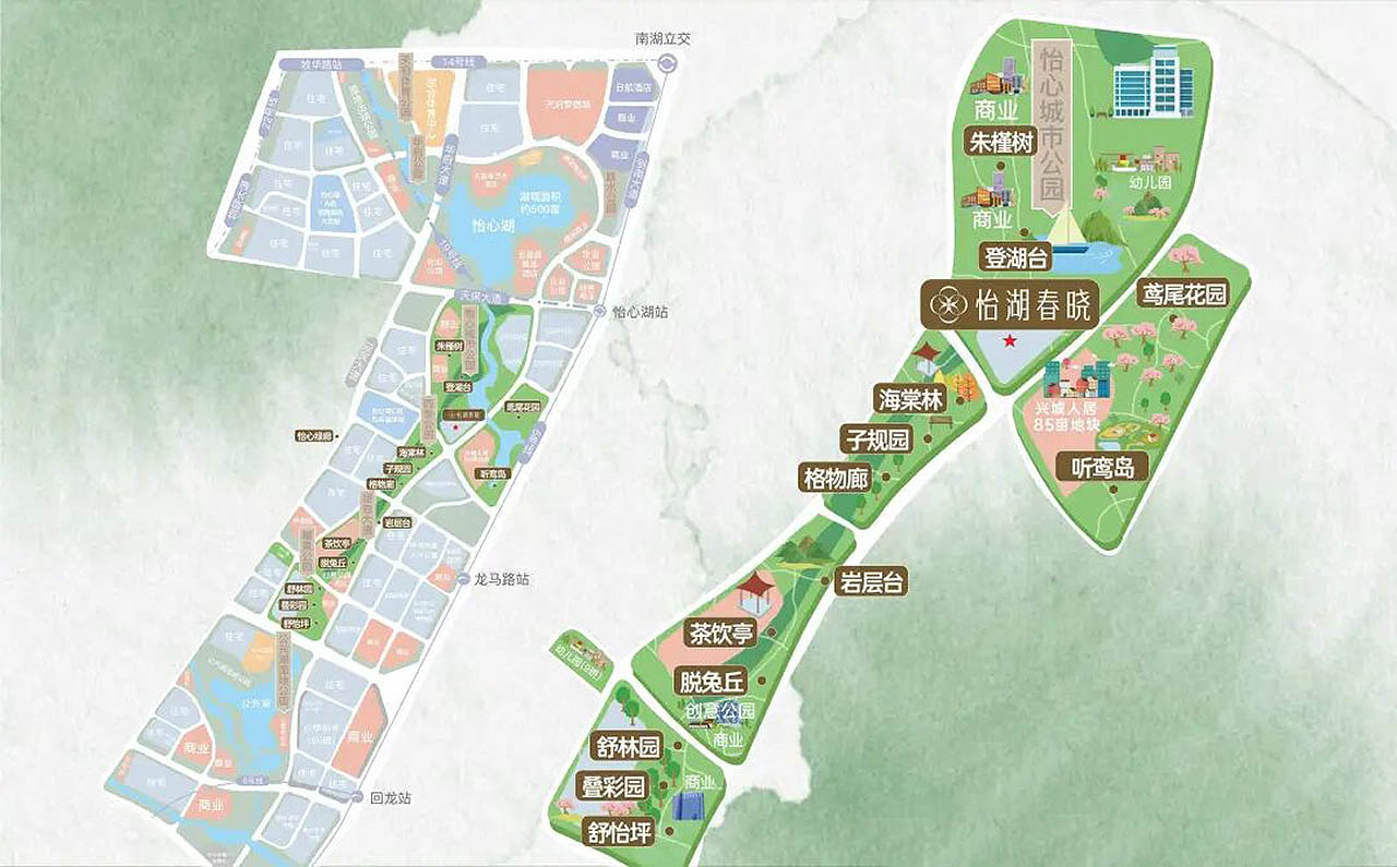 将全新居住空间嵌入约1100亩公园之中,让湖、公园、住区无界串联,打造成为全新的生活模式。在“茂林修竹、鸾鸟自歌”中归家,于城市、自然中,寻得生活怡然的全新体验。