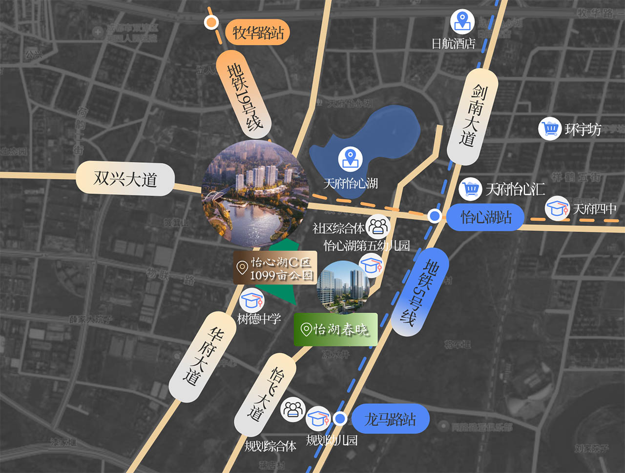 打破规划边界,择址怡心湖核心,不仅三面环抱公园,周边更是有多所高新企业汇聚,加速区域产业发展;十余所名校环伺,近享树德中学资源;还有医疗、商业等赋新湖居封面。