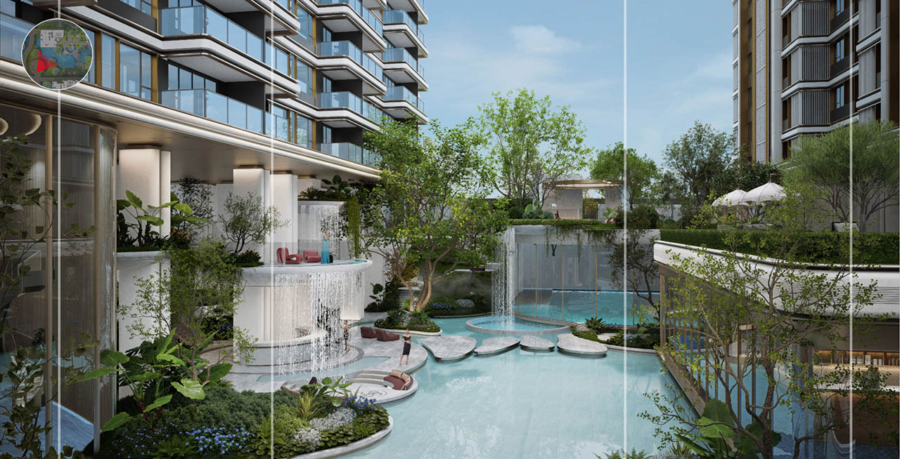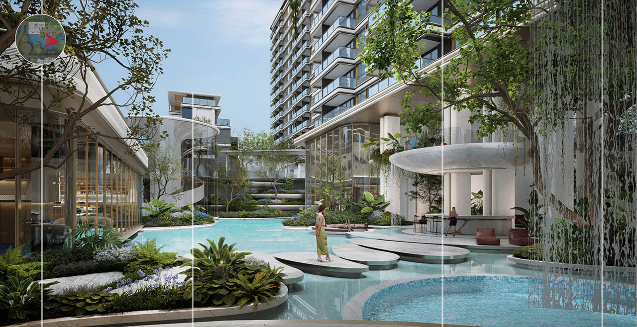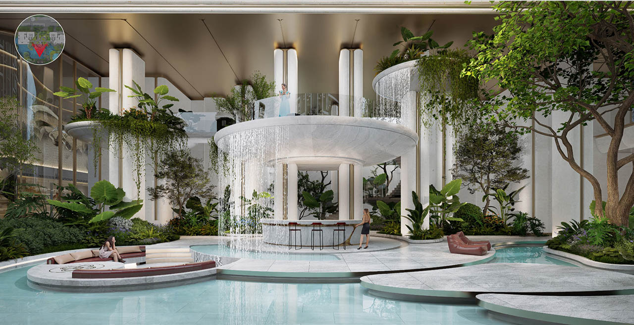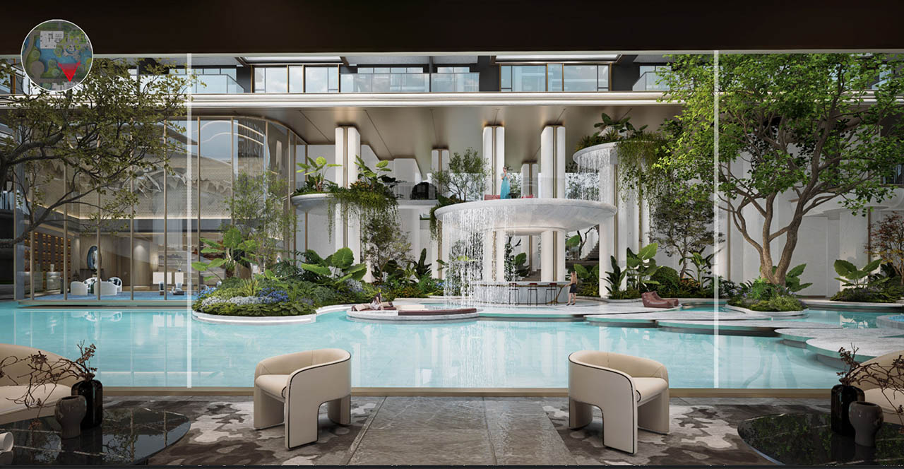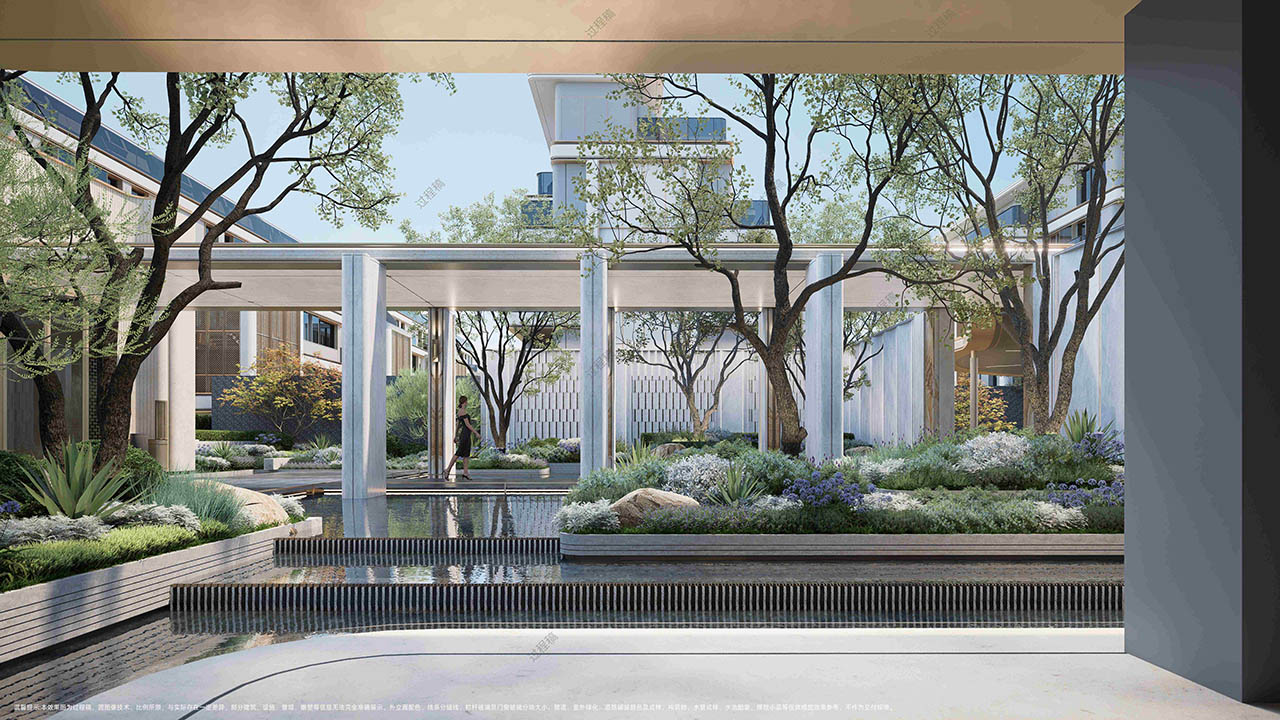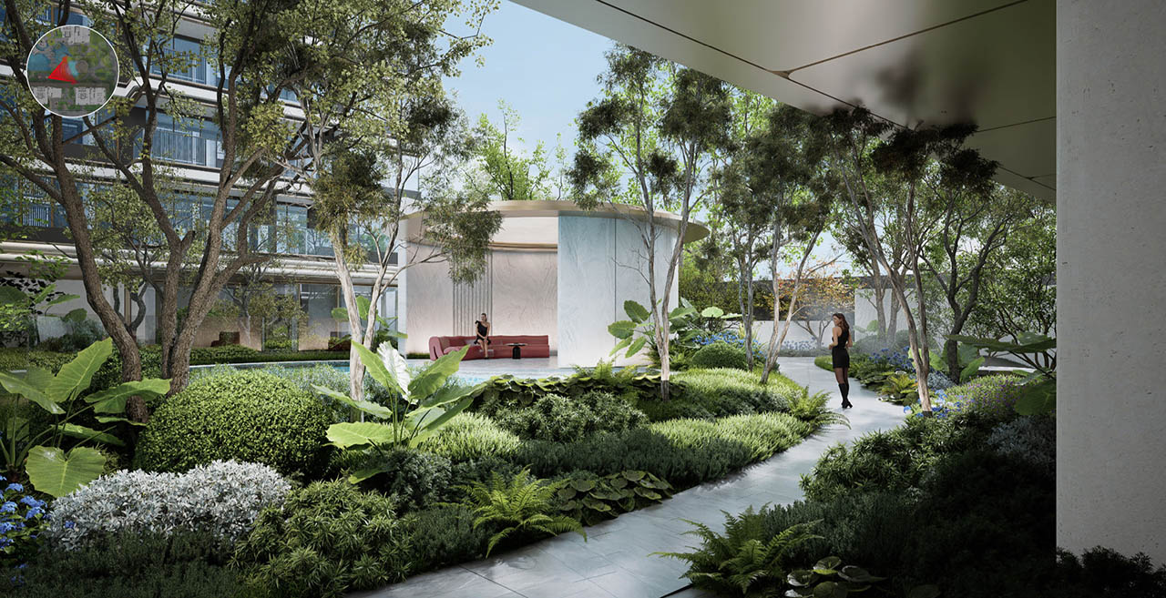 摒弃常规的平面化绿化,以“折叠手法” 打造立体叠瀑森屿。约10米高差的坡地之上,水流从云端倾泻而下,形成层次分明的叠瀑景观;植被随高差错落分布,乔木、灌木与花草构成垂直生态系统,不仅提升景观的视觉冲击力,更实现生态功能叠加。