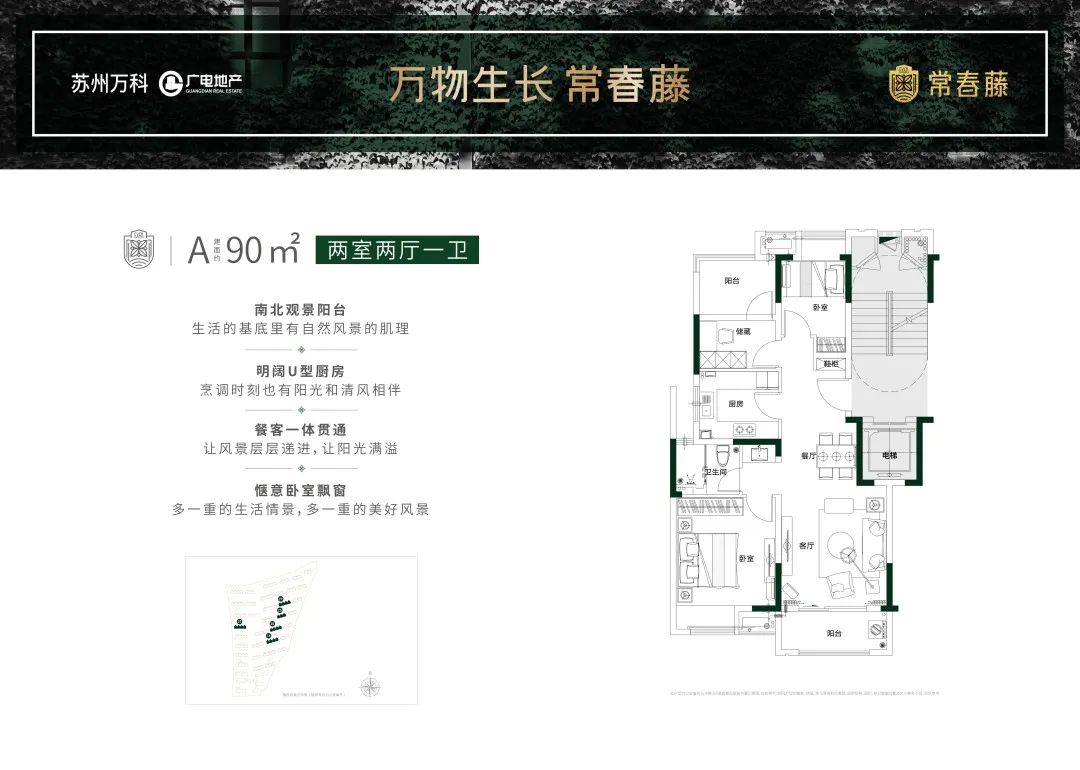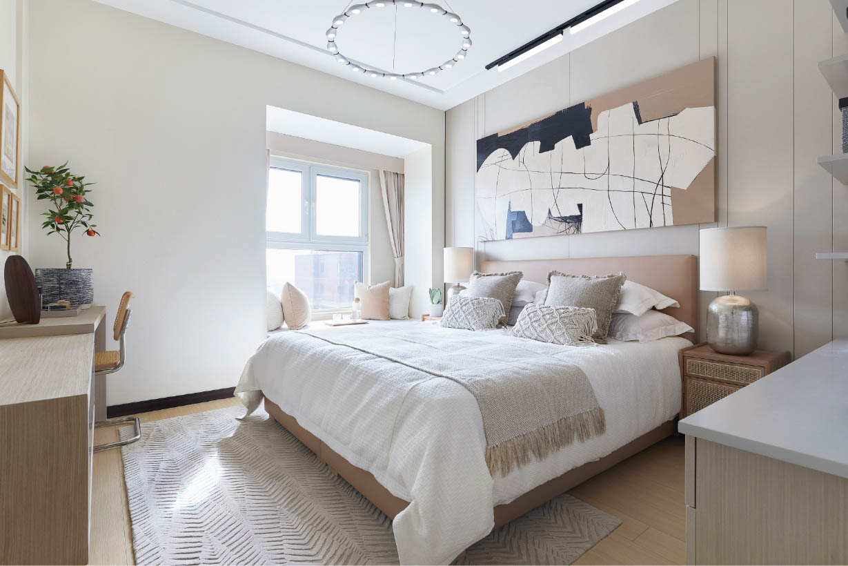 我们是纯洋房住宅,一梯两户,得房率高,南北通透,小户型的90㎡做到了2+1的改变,精装交付。